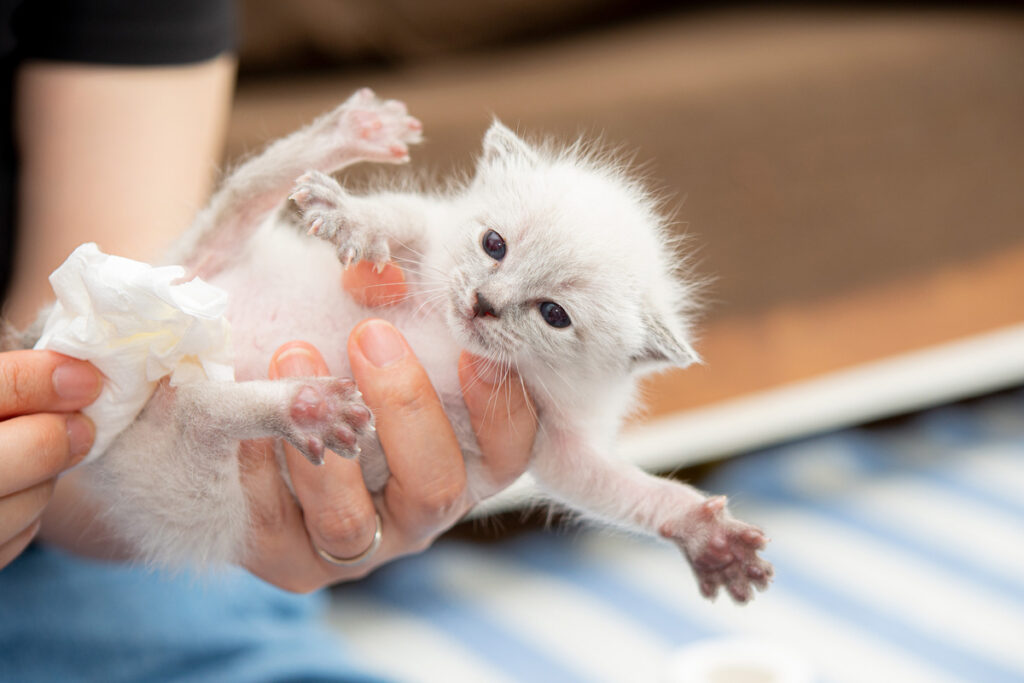 赤ちゃん猫の身体はきっと汚れています。でも、だからといって身体をシャワーで洗ったりするのはやめてください。