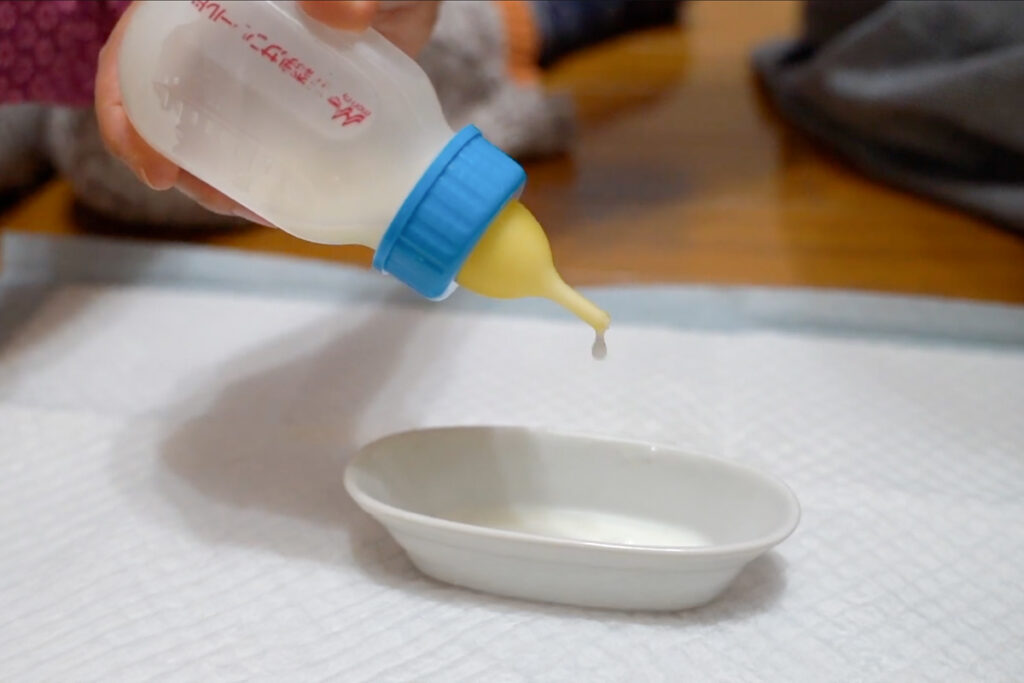 シリンジでミルクを吸い取り、ゆっくり口に入れてあげます。