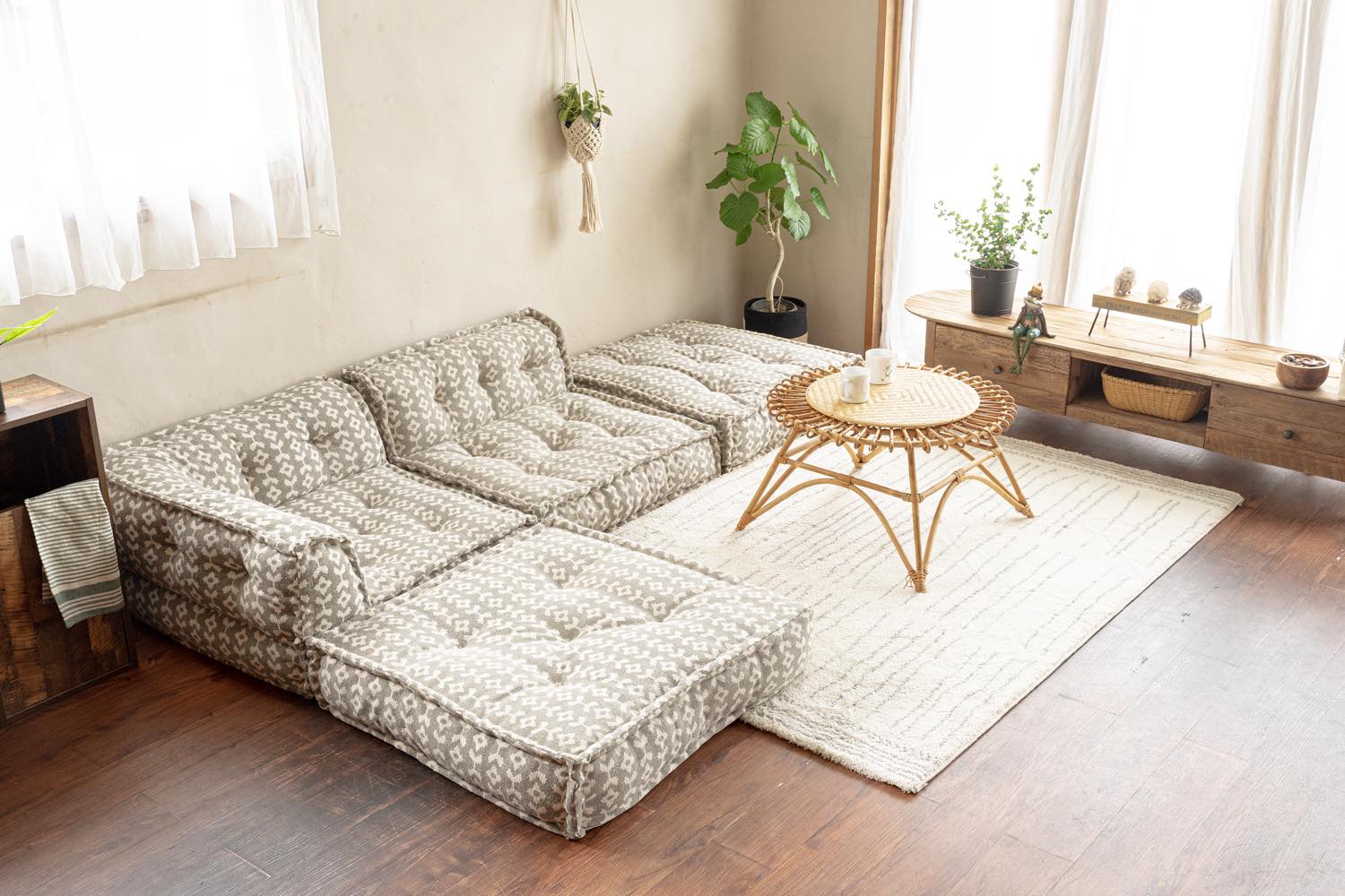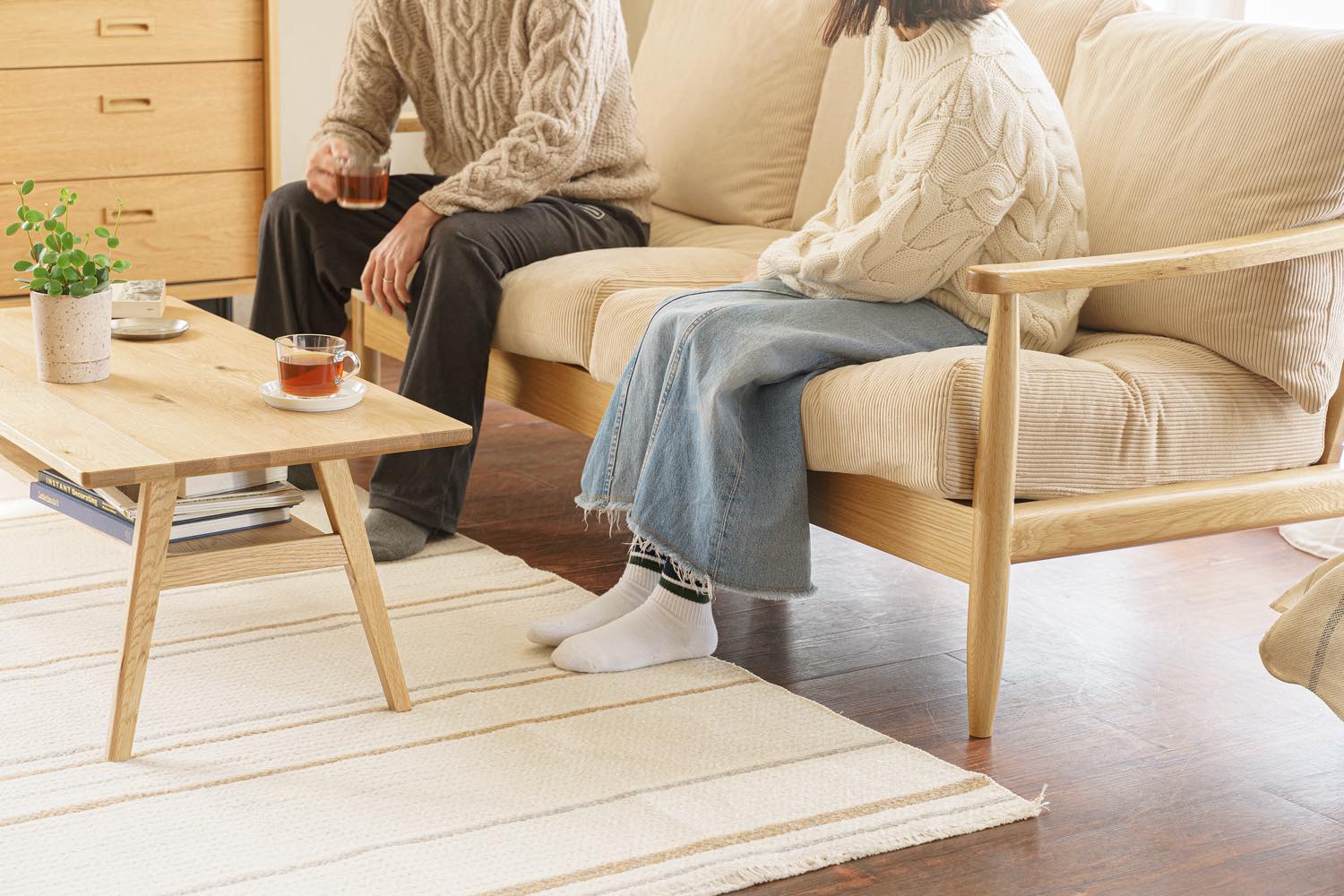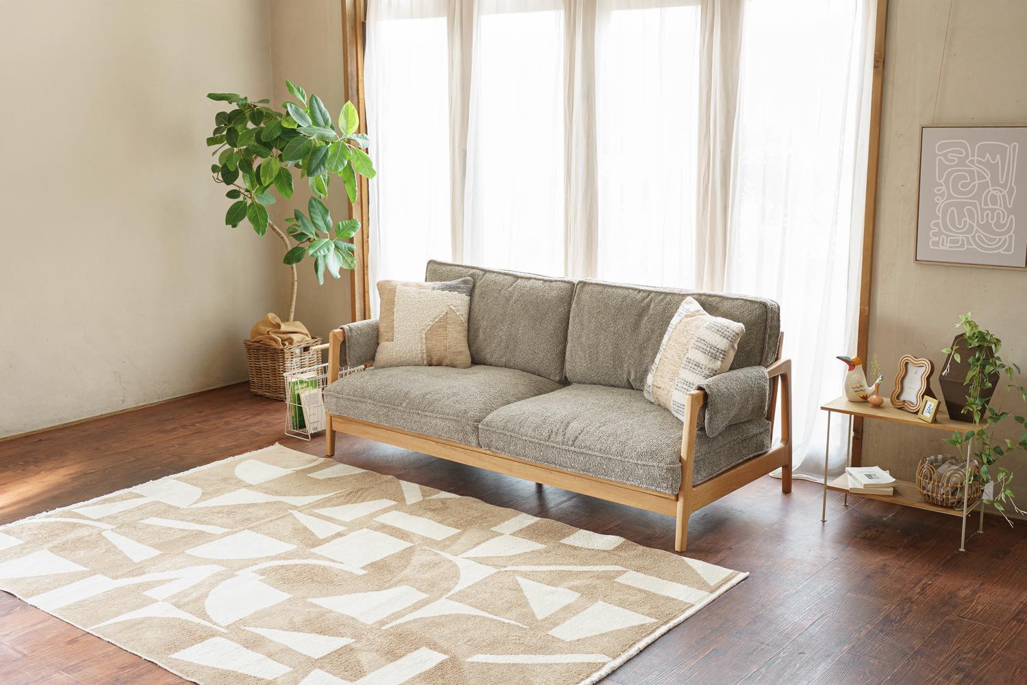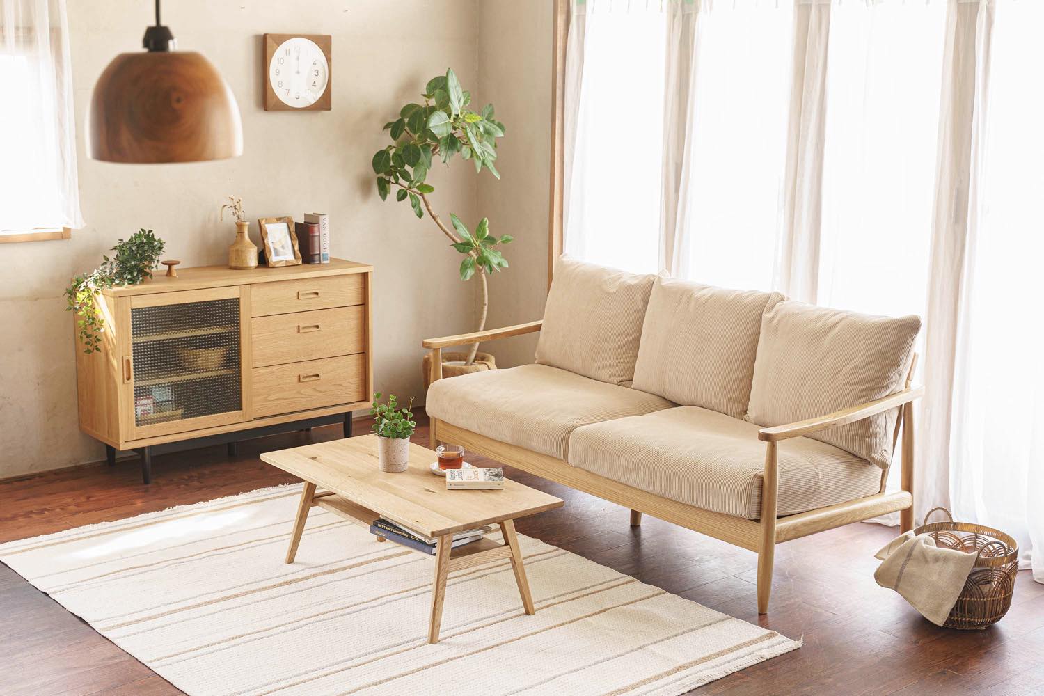ライフスタイル・イメージカット: リビング空間での配置例や、クッション・照明とのコーディネートを通じて、お部屋の雰囲気や実際のサイズ感を直感的に伝えます。