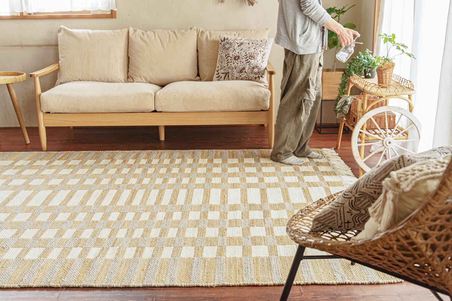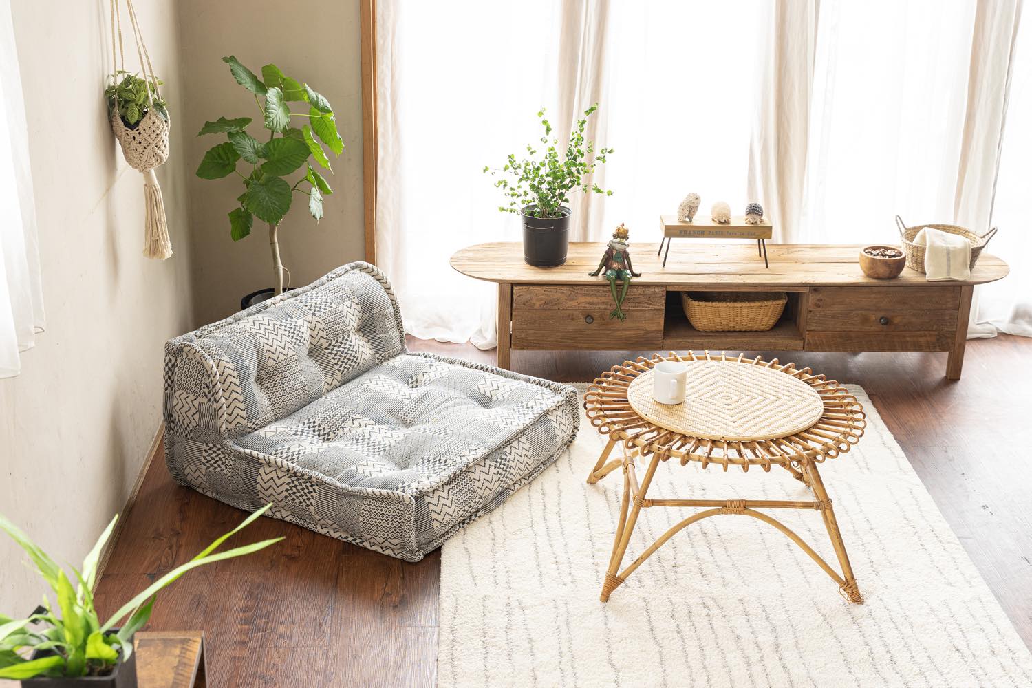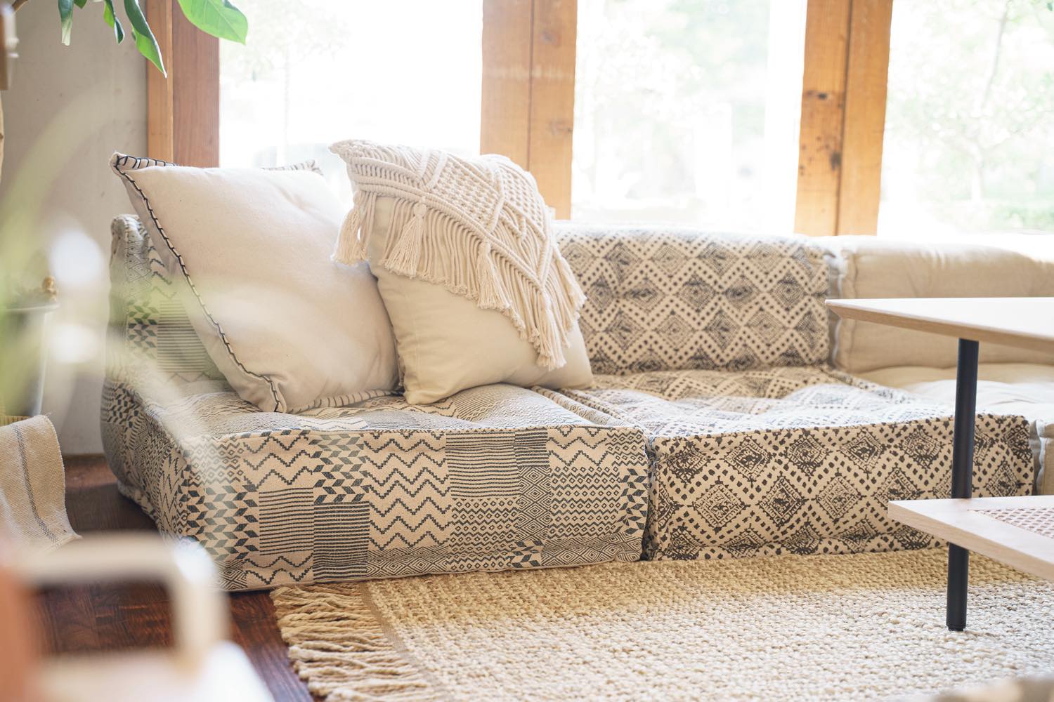 ライフスタイル・イメージカット: リビング空間での配置例や、クッション・照明とのコーディネートを通じて、お部屋の雰囲気や実際のサイズ感を直感的に伝えます。