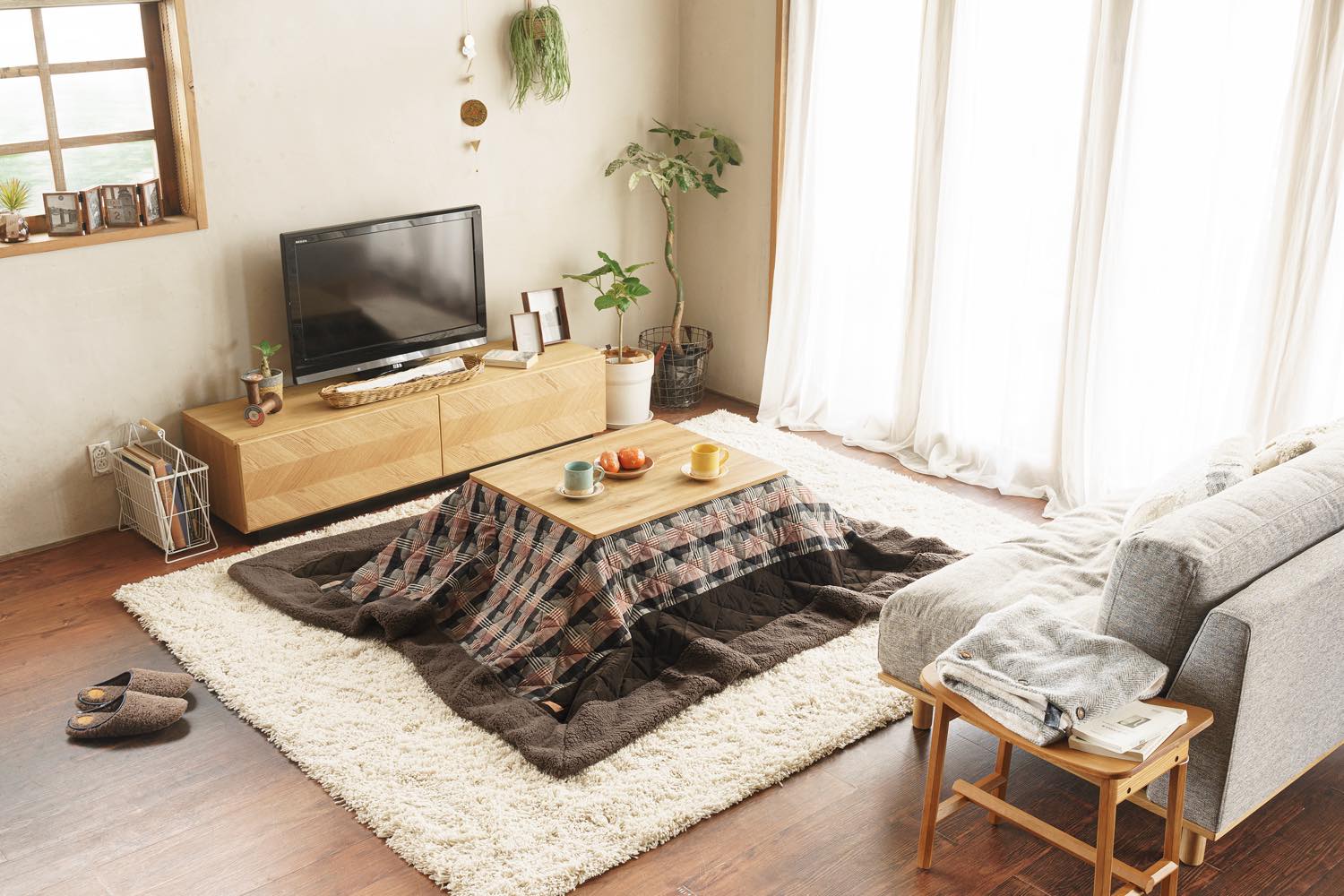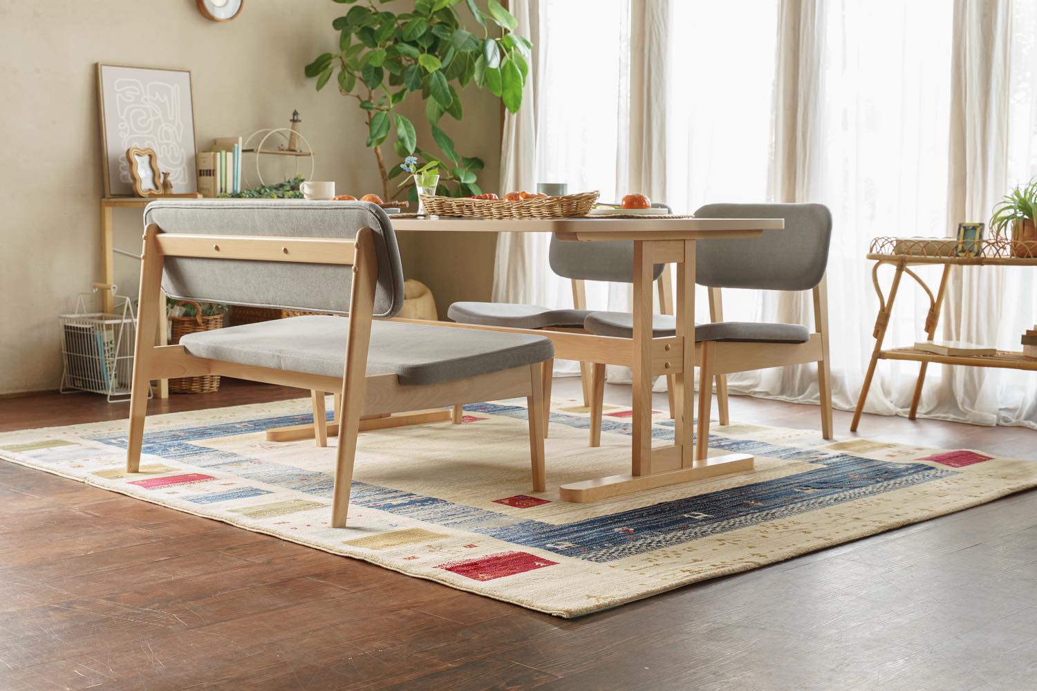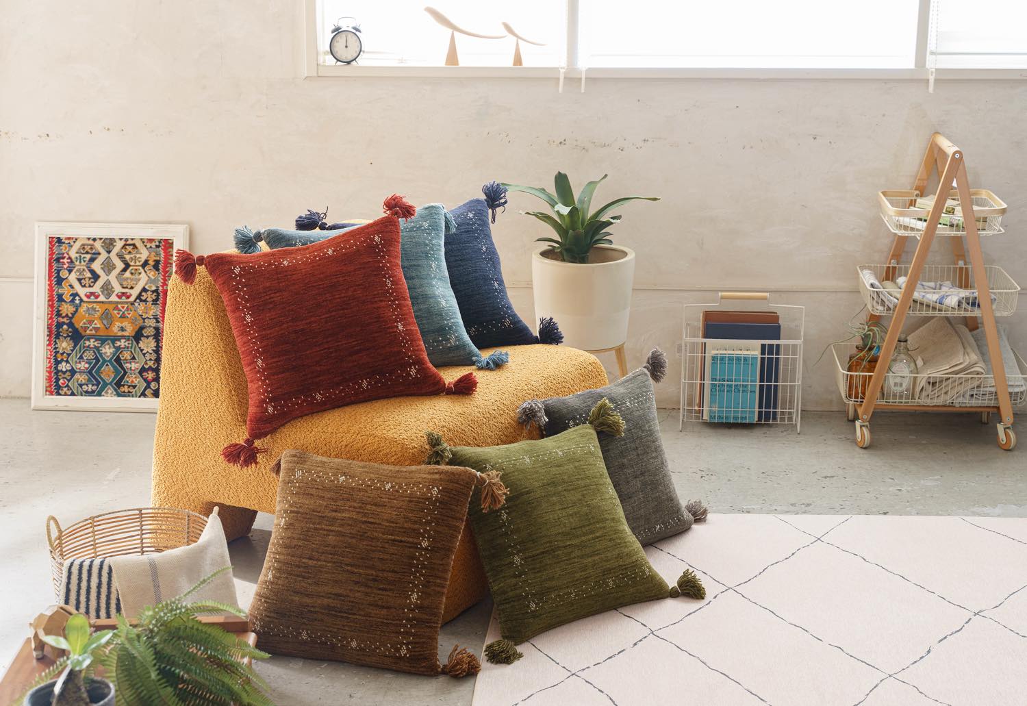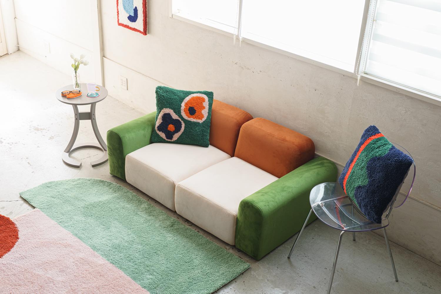 ライフスタイル・イメージカット: リビング空間での配置例や、クッション・照明とのコーディネートを通じて、お部屋の雰囲気や実際のサイズ感を直感的に伝えます。