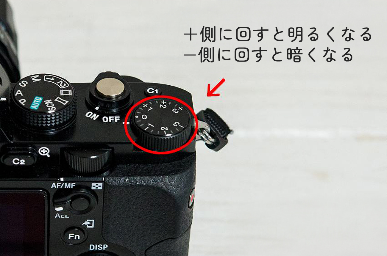 他のカメラだと「-/+」みたいなボタンがシャッターボタンの近くにあると思います。それを押しながら、左右にダイヤルを回します。
